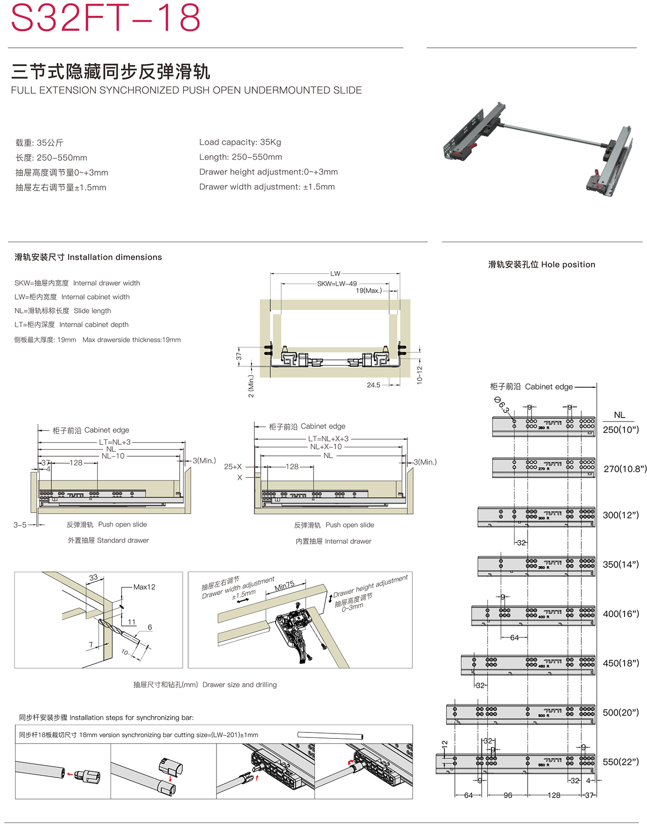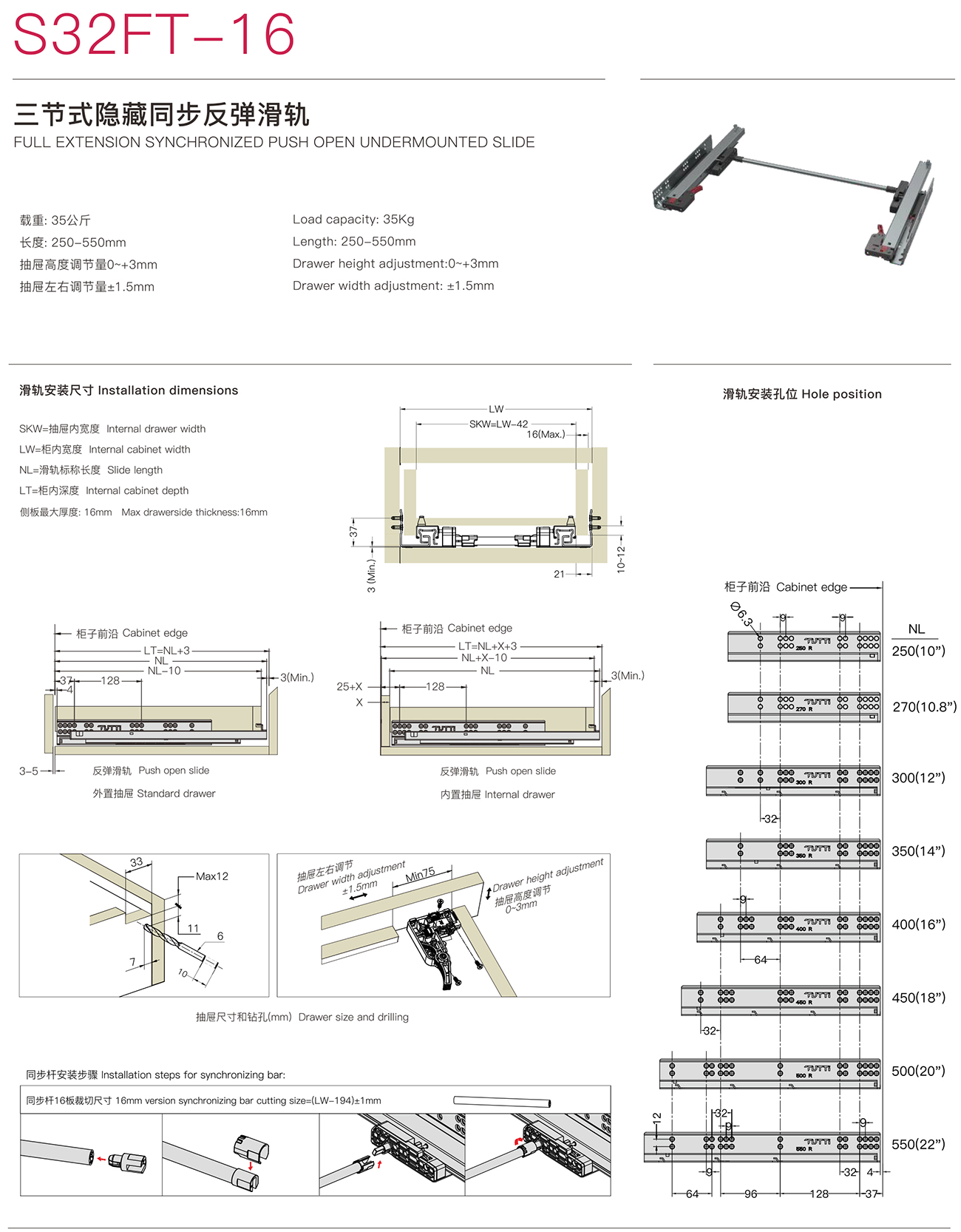 S32FT SYNCHRONIZED FULL EXTENSION PUSH TO OPEN UNDERMOUNTED SLIDE WITH STABLIZER