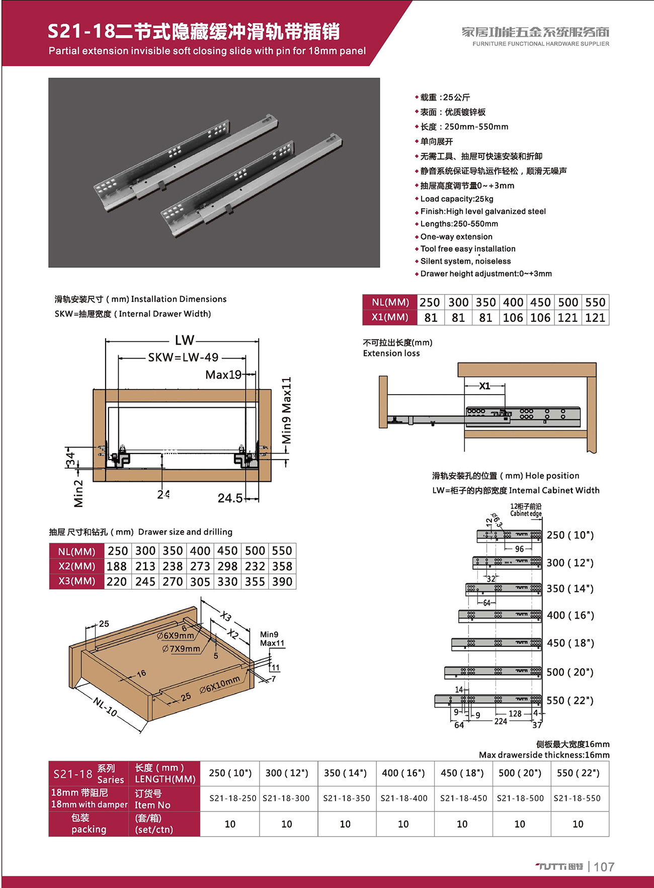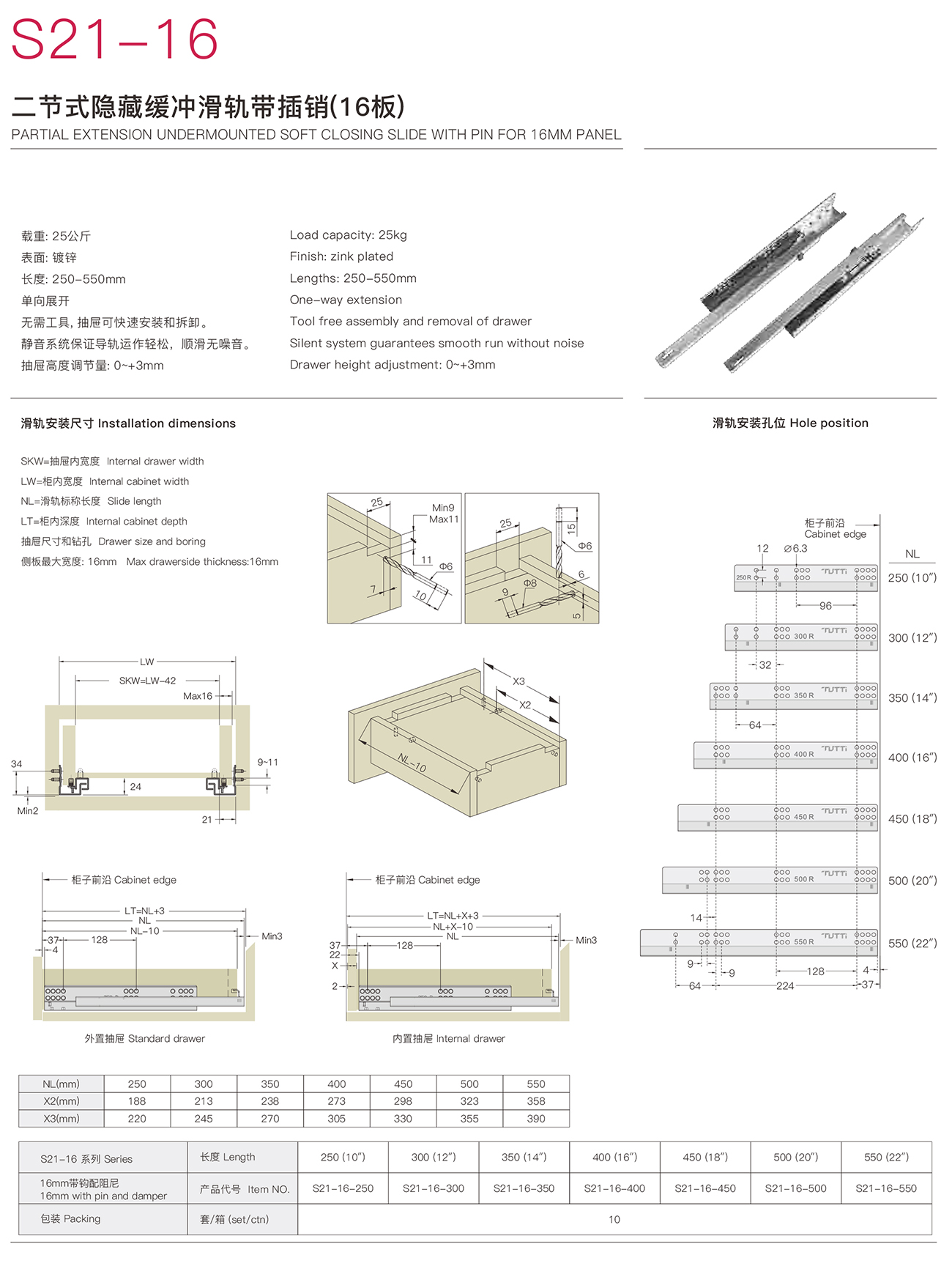 S21 PARTIAL EXTENSION UNDERMOUNTED SOFT CLOSING SLIDE WITH PIN FOR 16MM PANEL
