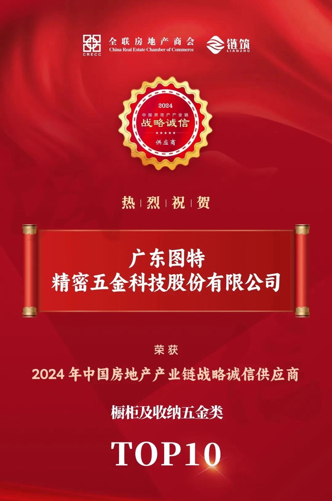 近日,以“鏈新質?筑好房”為主題的RIDC 2024房地產創(chuàng)新發(fā)展大會暨年度盛典在北京隆重舉辦,會議上發(fā)布備受矚目的《中國房地產產業(yè)鏈戰(zhàn)略誠信供應商研究報告》,圖特五金憑借卓越的實力和誠信的經營,榮獲“2024年中國房地產產業(yè)鏈戰(zhàn)略誠信供應商”櫥柜及收納五金類TOP10強品牌。