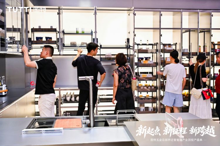 剪彩的余韻中,嘉賓移步全新啟幕的智造殿堂。以“精工基因庫”為設(shè)計理念的空間內(nèi),六大核心品類通過“技術(shù)可視化”裝置演繹硬核優(yōu)勢:始于廚房收納區(qū),靜音承重系統(tǒng)解決櫥柜高效存取痛點;繼而深入基礎(chǔ)五金區(qū),鉸鏈的緩沖技術(shù)與滑軌的精密導(dǎo)向,奠定空間流暢運作基石;轉(zhuǎn)向吊滑輪專區(qū),安全承重系統(tǒng)展示吊柜平穩(wěn)升降的解決方案;延伸至衣帽間區(qū),智能收納組件實現(xiàn)垂直空間極致利用。水槽龍頭作為生態(tài)鏈破界之作,以創(chuàng)新設(shè)計與材質(zhì)工藝,完整驗證圖特五金“從單品創(chuàng)新到全屋系統(tǒng)交付”的戰(zhàn)略升級路徑。